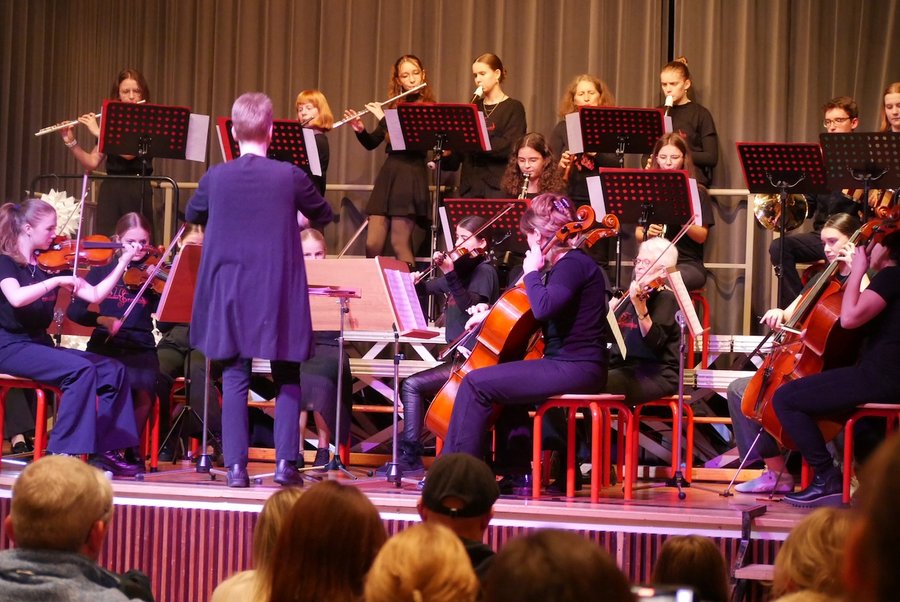 Eröffnet wurde der Abend durch den gelungenen Vortrag des Instrumentalkreises gemeinsam mit Schülerinnen der sechsten Klassen (Leitung: Katharina Hagelauer-Walder und Melanie Popescu), die ihre Zuhörer mit Filmmusik aus „Der Grinch“ begeisterten. Neben den Instrumental-Ensembles zeigten Orientierungs-, Mittelstufen- und MSS-Chor ihr Können. Mit „Imagine“ von John Lennon drückten die fünf Sängerinnen der Schulband in berührender Art den sehnlichen Wunsch nach Frieden und Zusammenhalt aus. Dies klang auch in den Beiträgen des MSS-Chores und des Mittelstufen-Chores an. Brachte der MSS-Chor (Leitung: Ursula Vollrath) mit „Carol of the bells“ eine Bearbeitung eines ukrainischen Volksliedes zu Gehör, verabschiedete sich der Mittelstufen-Chor (Leitung: Andrea Liese) mit einem Arrangement von „We are the world“ und dem musikalischen Wunsch nach einer positiven Zukunft. Der Orientierungsstufen-Chor (Leitung: Anke Kühner) blickte mit einem Medley aus Sternsinger-Liedern bereits auf die Zeit nach Weihnachten, wenn am 17. Januar 2026 in den Räumen des St.-Franziskus die bistumsweite Abschlussveranstaltung der kommenden Sternsinger-Aktion stattfinden wird. Mit ihrem engagierten Vortrag machten sie auf die Rechte der Kinder aufmerksam, die im Zentrum der Sternsinger-Aktion 2026 stehen.